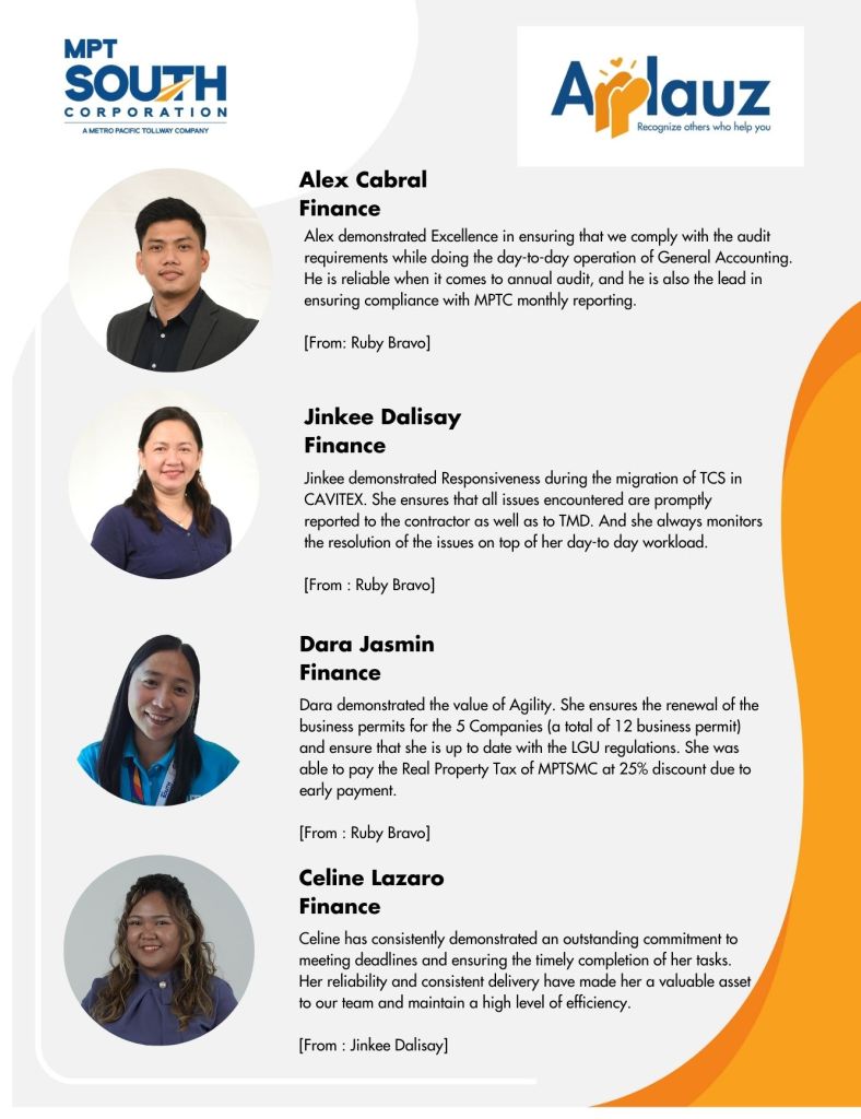 employee's beat Applauz: January to February 2024 Let us put a spotlight on these employees for the months of January and February 2024. Your Applauz incentive shall be coordinated with you by HR. <Previous Next> Share this: Click to share on X (Opens in new window) X Click to share on Facebook (Opens in new window) Facebook Click to share on LinkedIn (Opens in new window) LinkedIn Click to email a link to a friend (Opens in new window) Email Like Loading...
