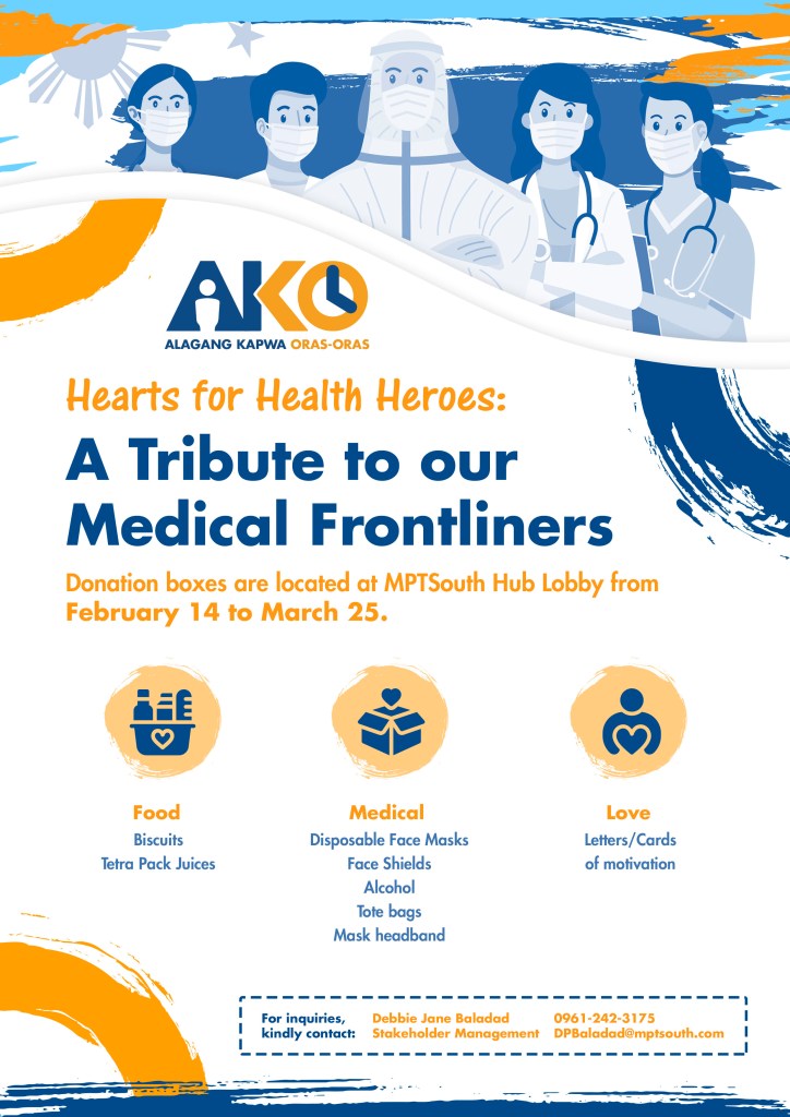 The Stakeholder Management team in partnership with Contracts Administration Department is very excited to launch the start of this year’s donation drive. On February 15, the project unveiled its theme for February to March. Hearts for Health Heroes aims to pay tribute to our medical front liners. Food such as tetra pack juices and biscuits can be donated. Medical supplies like disposable face masks, face shields, alcohol, tote bags, and mask headband. Letter and motivational cards can also be donated. This way, we can show and make our front liners feel our love, care, and support for them. Employees are encouraged to bring whatever it is that they can in line with the theme until March 25, 2022.