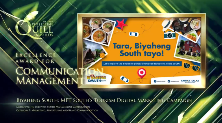 Just this year, MPT South bags its third Anvil Award for the CALAX Silang East Interchange Communication Campaign and took home its first Quill Awards for the company’s communication programs “Biyaheng South” and “Drayberks”.