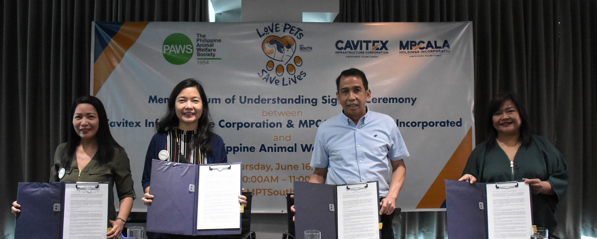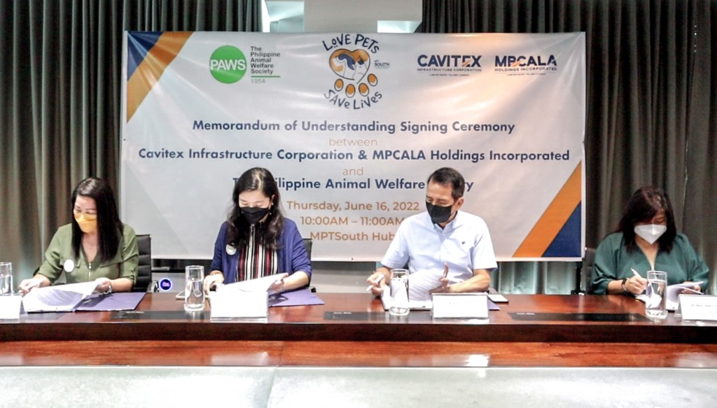 JUNE 16, 2022– Metro Pacific Tollways South (MPT South), a subsidiary of Metro Pacific Tollways Corporation (MPTC), the toll road development arm of Metro Pacific Investment Corporation (MPIC), signed a Memorandum of Understanding (MoU) with the Philippine Animal Welfare Society (PAWS) to address cases of stray animals wandering the busy roads of the Manila-Cavite Toll Expressway (CAVITEX), CAVITEX C5 Link, and the Cavite-Laguna Expressway (CALAX).